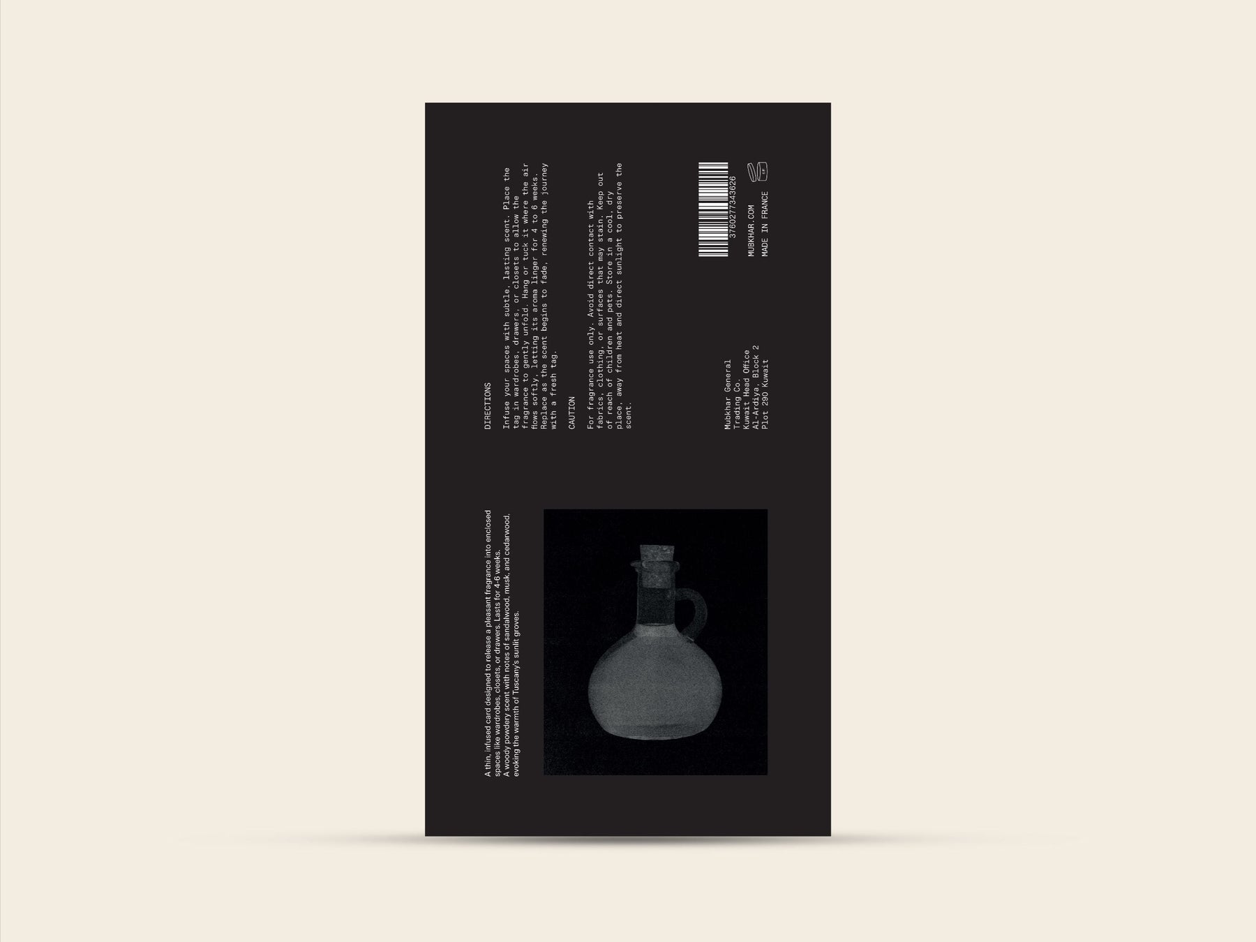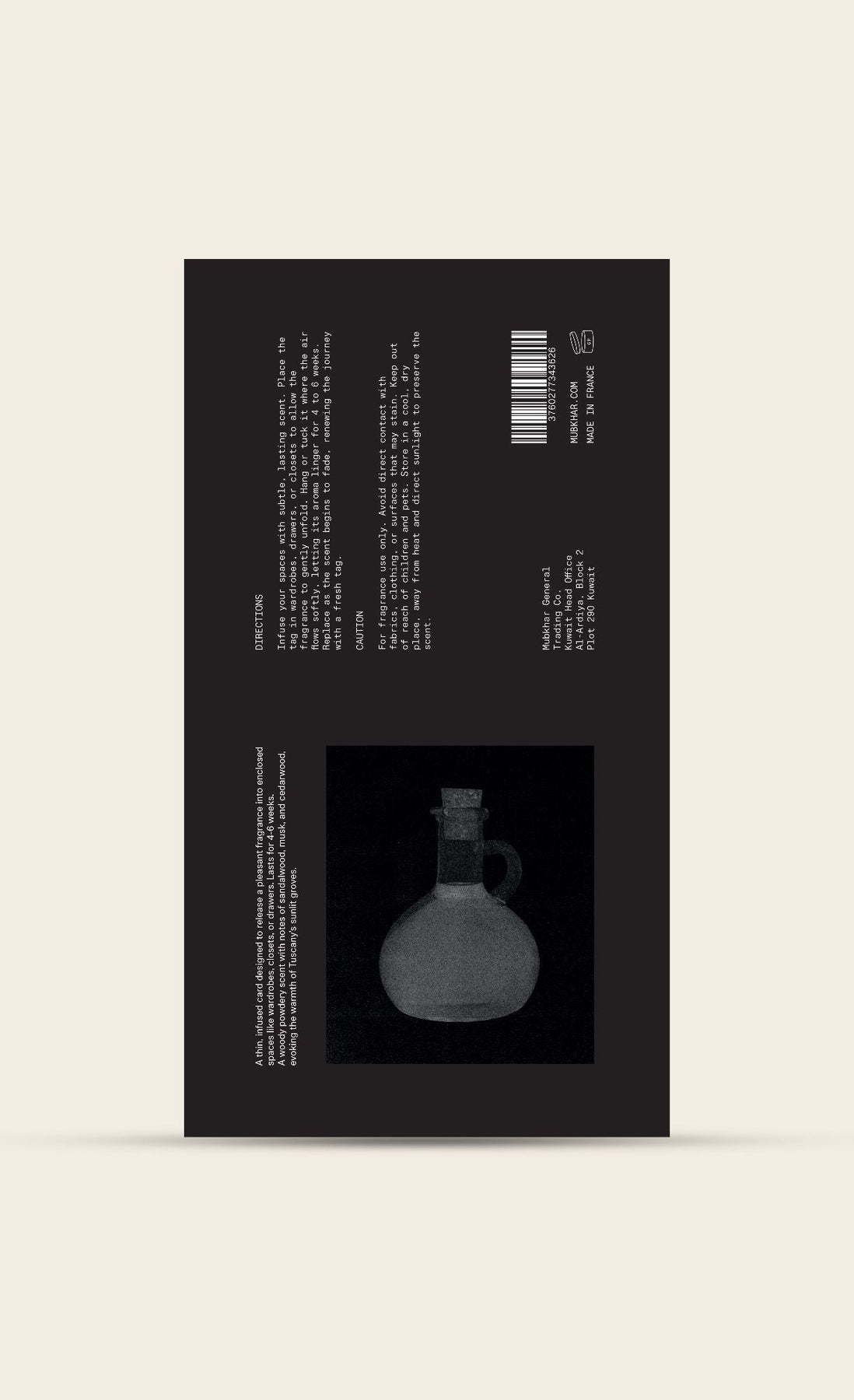 Place the tag in a wardrobe, drawer or closet where air flows gently. Avoid direct contact with clothing or fabric. Replace after 4–6 weeks or once the scent begins to fade.